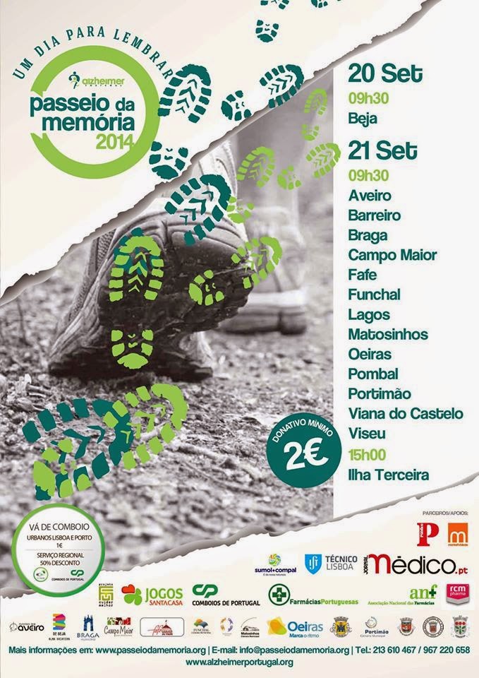 O Dia Mundial da Pessoa com Doença de Alzheimer, comemora-se a 21 de Setembro e, para o assinalar, Alzheimer Portugal prepara-se para levar a cabo, dias 20 e 21 Setembro, a quarta edição do Passeio da Memória, em 15 cidades portuguesas: Beja (20/09/2014); Aveiro, Barreiro, Braga, Campo Maior, Fafe, Funchal, Lagos, Matosinhos, Oeiras, Pombal, Portimão, Viana do Castelo, Viseu e Ilha Terceira (21/09/2014).